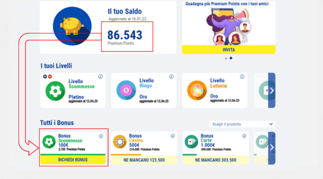 I punti Premium vengono convertiti in bonus. A seconda del livello (maturato in relazione al saldo dei punti base spiegati a sinistra) è possibile accumulare un ammontare di punti premium i quali andranno a concorrere ad un "borsello comune" o "Saldo Unico" di punti premium. Dal saldo unico sarà poi possibile decidere il tipo di tranche da convertire in bonus disponibili fra i vari giochi che concorrono al loyalty program. In base al livello raggiunto esiste un diverso moltiplicatore di bonus che si accumula moltiplicando un punto base, ad esempio: Per un livello ORO nel Casino Live per ogni punto base accumulato si ottengono 2,5 punti premium