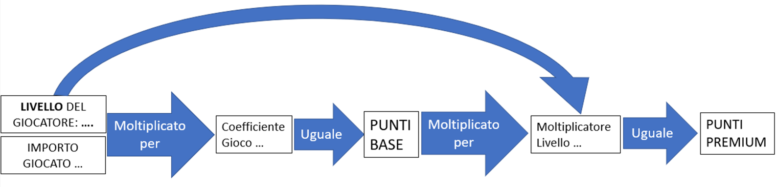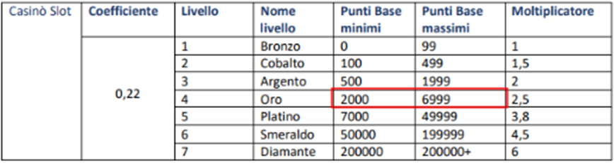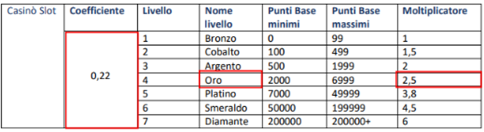 - Considerando che: bisogna moltiplicare ogni € giocato alle slot per il coefficiente 0,22 per avere i punti base e che questi devono essere moltiplicati per il moltiplicatore del livello a cui si appartiene per ottenere i punti premium