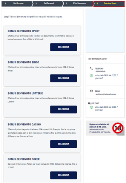 Risposta: Se dopo la selezione è stata finalizzata la registrazione non è possibile, dopo aver selezionato il bonus benvenuto al 4° step di registrazione non è possibile effettuare una variazione.