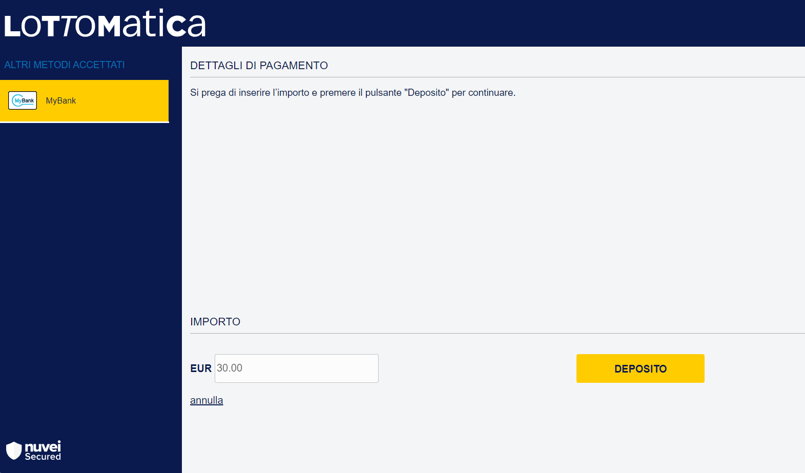 Inserisci l'importo e dopo aver cliccato su “Avanti”, si aprirà la pagina di Nuvei dove dovrai confermare l’importo di deposito: