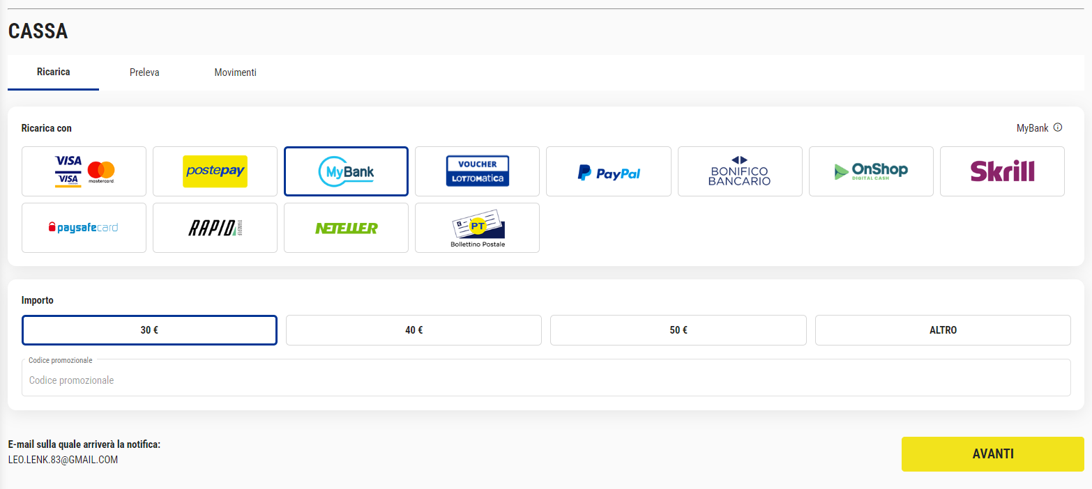 Al termine della conferma l’importo sarà subito disponibile sul Conto Gioco.