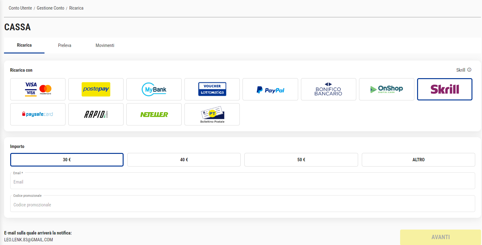 Ti appariranno nella schermata successiva tutti i metodi di deposito, compreso Skrill: