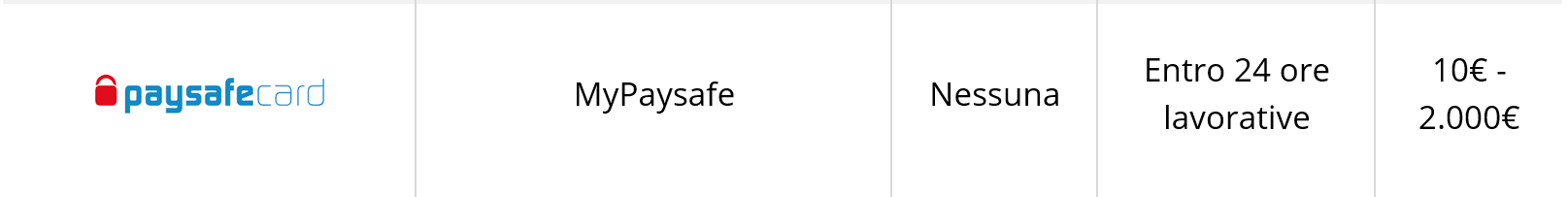 Paysafecard è uno strumento di pagamento online che, con l’ausilio di un conto Paysafecard ricaricato con la somma di codici prepagati, del valore da 10 – 25 - 50 e 100 euro, consente di effettuare un prelievo Paysafecard sul Conto Gioco con accredito immediato.