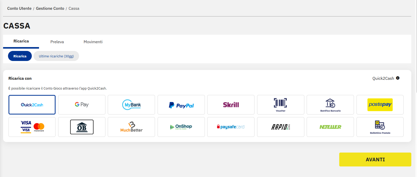 Per poter caricare il conto gioco, devi prima avere della disponibilità sul conto di moneta elettronica. E' possibile ricaricare il wallet Quick2Cash dalla Dashboard dell’app, oppure nella sezione “Il mio conto”, attraverso una delle modalità a disposizione: