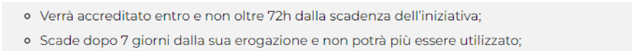 - I tempi di accredito del bonus sono di 72 ore lavorative dal termine della promozione
