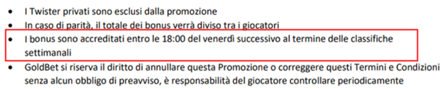 Bisogna considerare che i tempi di erogazione dei bonus di ogni promozione variano a seconda dei termini e condizioni e possono essere accreditati: