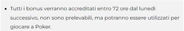- I tempi di erogazione del bonus dal termine del torneo, che sono di 72 ore lavorative