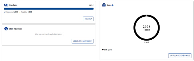 Accedendo nell’area personale è possibile visualizzare sulla destra il saldo bonus disponibile, il saldo bonus visibile è SEMPRE riferito a bonus ATTIVI, cliccando su “VAI ALLA SEZIONE BONUS” sarà possibile accedere al dettaglio per ogni stato: