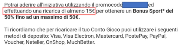 Molte promozioni presentano dei vincoli di ricarica variabili, per poter usufruire del bonus quindi la ricarica deve avere un importo minimo pari a quanto indicato nella promozione.