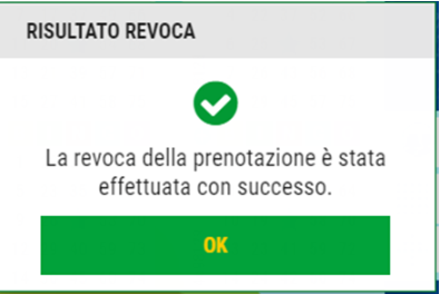 - Cliccando su REVOCA PRENOTAZIONE, la revoca sarà confermata come da notifica del pop up in basso