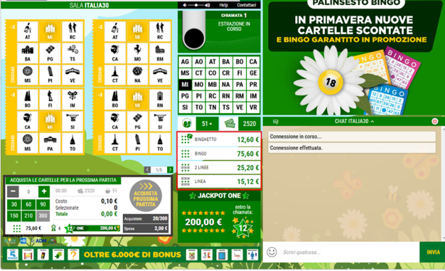 In ogni sala bingo nella sezione centrale, subito sotto il numero di partecipanti ed il totale cartelle acquistate, è possibile verificare i premi in palio nella partita in corso.
