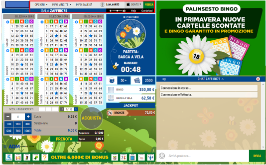 La sala del Bingo (o client) presenta le seguenti funzionalità: