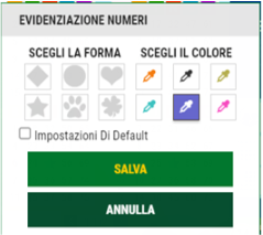 - Possibilità di selezionare il colore/forma in cui il numero estratto fra quelli delle schede acquistate viene evidenziato (cliccare su SALVA rende effettiva la modifica è necessario)