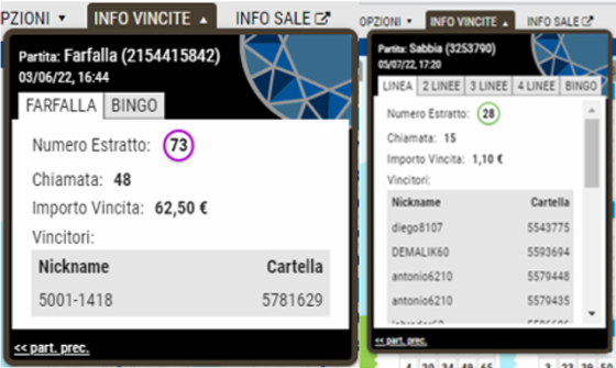 - Riporta le informazioni di dettaglio dei premi vinti nell’ultima partita. Per ogni singolo premio vinto (es. premio a simbolo FARFALLA, 1 LINEA, 2 LINEE, BINGO etc…) si visualizza: L’ultimo numero estratto che ha permesso la vincita