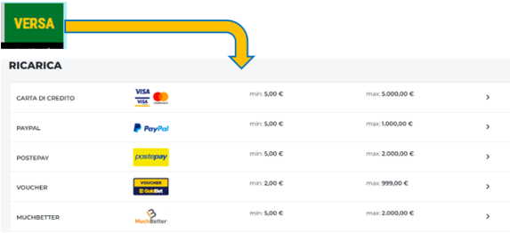 La sezione “VERSA” (RICARICA per LTM) apre una nuova scheda con la sezione ricariche del sito, per poter effettuare un deposito.