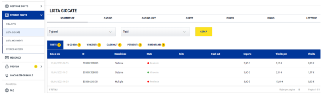Appurato lo stato in corso con avvenimento presente sullo storico dei risultati del sito, sarà necessario reperire l’ID della giocata e riportarlo all’assistenza.