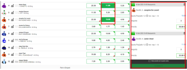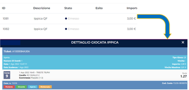 - Bisogna tener presente che ogni scommessa a quota fissa sulla stessa corsa è SINGOLA, per ogni quota puntata si generano biglietti separati, pertanto selezionando 2 quote della stessa corsa, si generano 2 biglietti e scommettendo si generano 2 transazioni (verificabili in LISTA GIOCATE dall’orario e la data combacianti)
