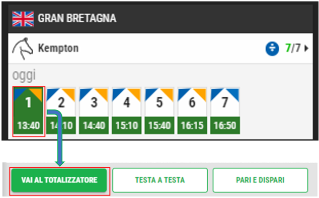 - Seleziona una corsa con scommesse a totalizzatore disponibili e clicca su “Vai a Totalizzatore”