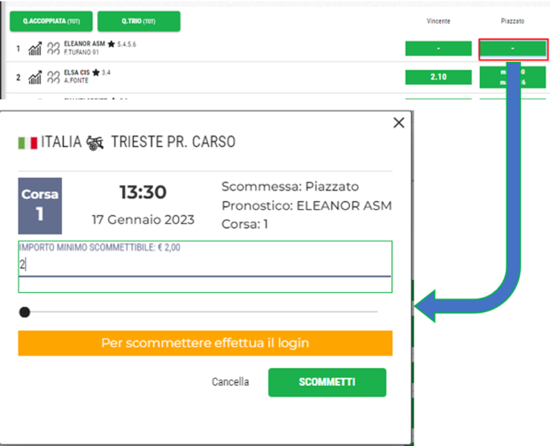 - È Possibile anche selezionare dal tabellone degli esiti una delle opzioni disponibili sul singolo cavallo per generare un pop up di scommessa: