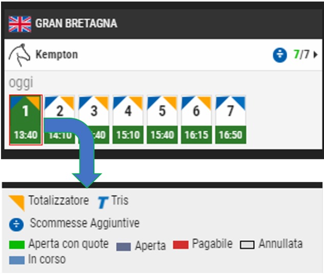 riquadro delle corse presenta colori e simboli differenti, ognuno dei quali è consultabile con la legenda presente in fondo alla pagina stessa; in questo caso, le puntate per la corsa 8 sono aperte con: quote disponibili, in corso, e con Scommesse Aggiuntive ed a "A Totalizzatore".