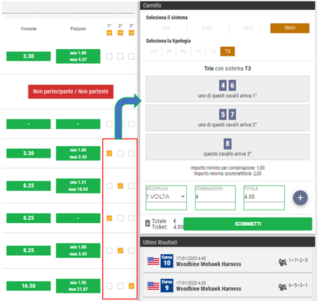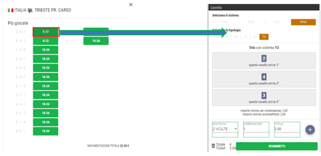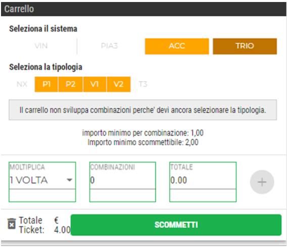 - Fra le quote accoppiata e trio di raccolta potrai selezionare quella preferita ed automaticamente al lato destro del sito verrà a generarsi il ticket nel carrello già con sistema e tipologia precompilati.