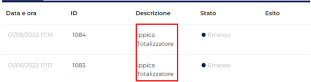 - Lo stesso dettaglio è visibile tramite la sezione “LISTA GIOCATE” le cui transazioni si distinguono per la “Descrizione” dal tipo a quota fissa
