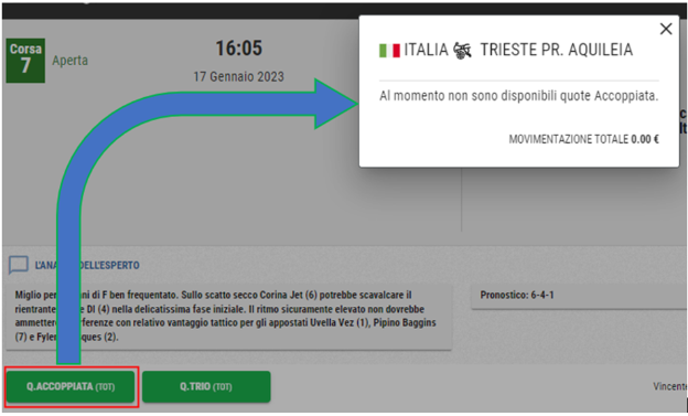 - Cliccando sulle puntate a totalizzatore proposte in testa al tabellone, il sistema mostrerà con un pop-up quali sono le combinazioni (accoppiata o Trio) più giocate fino a quel momento in base alla raccolta.