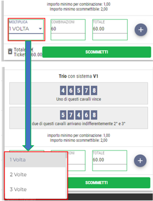 - In fondo al biglietto troverai il moltiplicatore da utilizzare e le combinazioni totali con quanto selezionato (in questo caso 6 flag x 3 = 18)