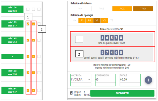 Questo sta a significare che 1 dei 5 cavalli della prima colonna vince e 2 dei 5 cavalli della seconda colonna arrivano 2° e 3°