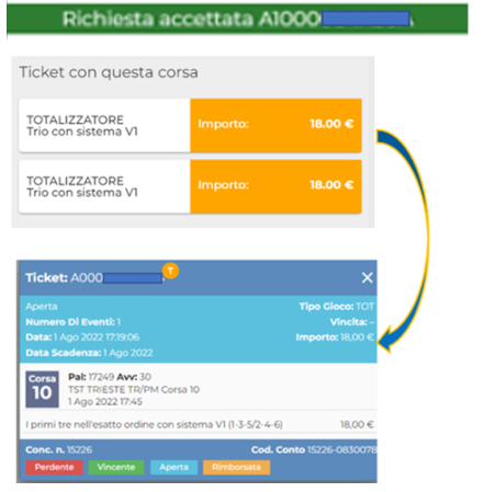 - A seguito dei settaggi desiderati clicca su SCOMMETTI e comparirà l’accettazione della scommessa il cui dettaglio è subito verificabile in basso subito sotto alla voce “Ticket con questa corsa”