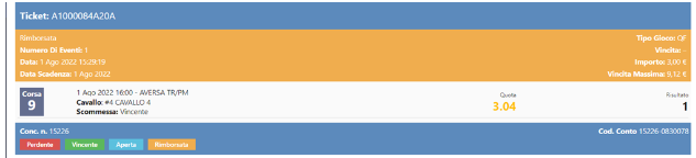 In tal caso, per quanto la scommessa possa essere stata accettata, non potrà mai essere refertata come vincente o perdente andando automaticamente dopo poco in stato “RIMBORSATO”.