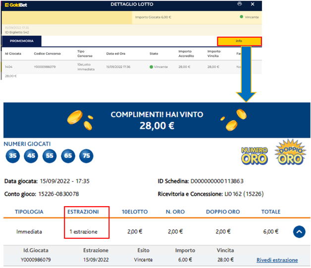 Si ricorda che per reperire il numero dell’estrazione, sia essa Lotto, 10&Lotto o Million day è necessario reperire il numero di estrazione dal dettaglio della giocata in “Lista Giocate”➡cliccare su “Info”➡controllare il numero di estrazione alla voce “Estrazioni”