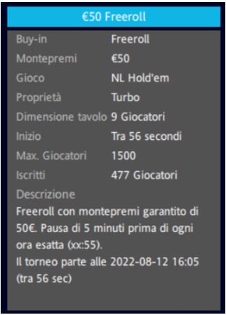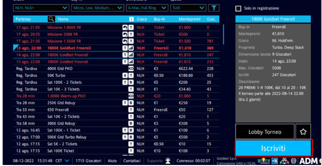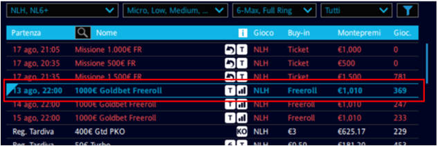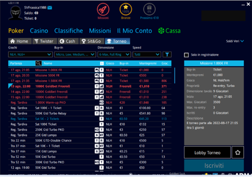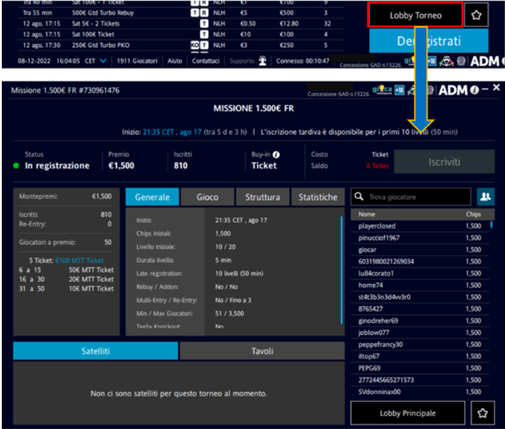 Per registrarsi ai tornei basta recarsi nella apposita sezione della lobby dove è presente il palinsesto: