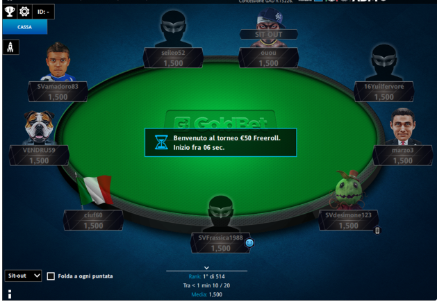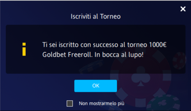 - Al momento dell’inizio del torneo il sistema aprirà un’altra finestra dando il benvenuto con un pop up