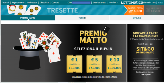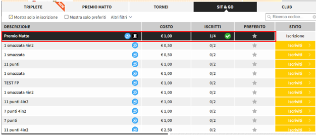 I tornei Premio Matto saranno a 4 giocatori in diversi tagli di buy in:1 €, 5 € e 10 €. Saranno disponibili in lobby nell’apposita sezione “Premio Matto”, oppure nella lista dei normali sit&go.