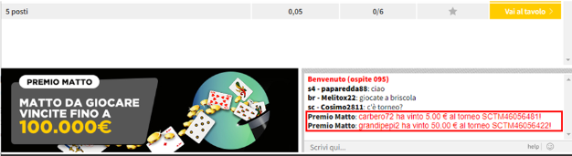 Le vincite nel premio matto, quando raggiunte, vengono annunciate nella chat pubblica della lobby
