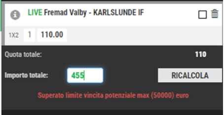- Superato il limite di vincita potenziale max (50000) euro : limite superato di vincita da singola
