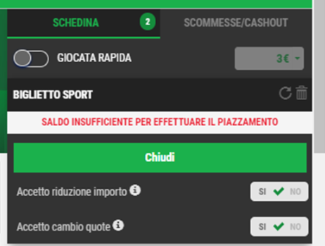 - Saldo insufficiente per effettuare il piazzamento In caso di saldo insufficiente per effettuare la scommessa con l’importo inserito, comparirà il seguente errore.