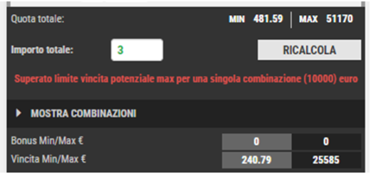 - Superato limite vincita potenziale max per una singola combinazione (10000) euro In caso il moltiplicatore fra quota totale ed importo investito superasse l’importo massimo di vincita potenziale (10.000,00 €), compare il seguente messaggio di errore bloccante.