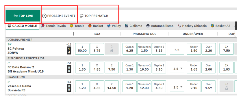 - Top Prematch (avvenimenti pre-match poco prima che inizino)