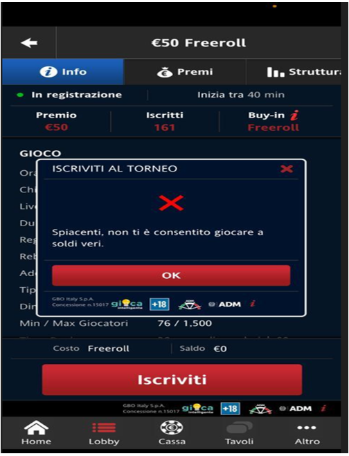 "Spiacenti. Non ti è consentito giocare a soldi veri"