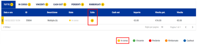 Per verificare se una scommessa è ancora “In Corso” è sufficiente verificare in “Lista Giocate” e se la transazione si presenta alla voce “Esito” con un simbolo giallo, allora, come indicato dalla legenda, la scommessa è ancora in corso